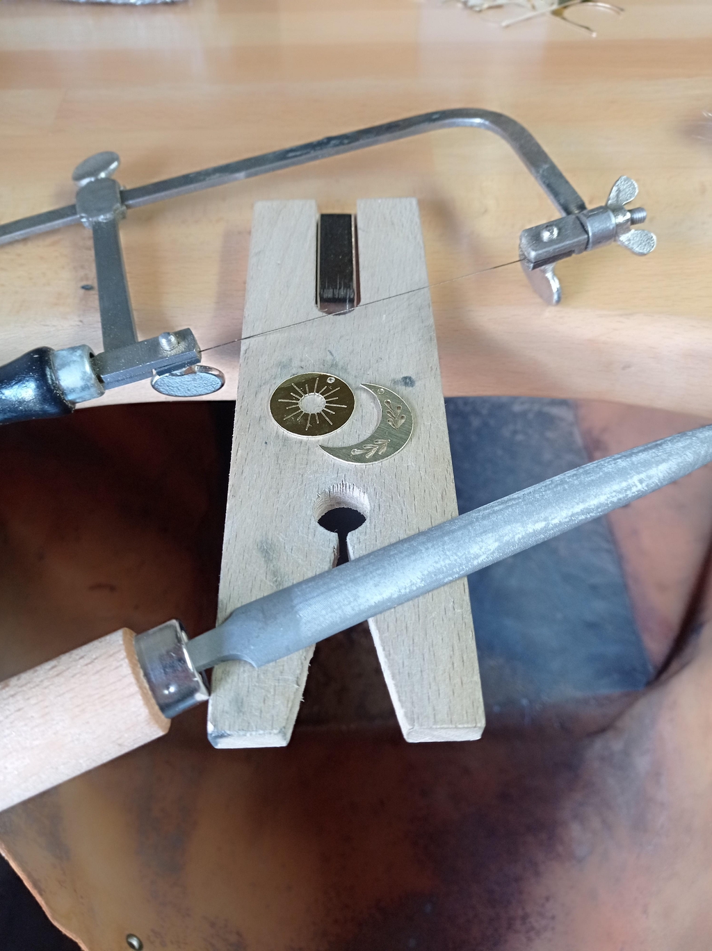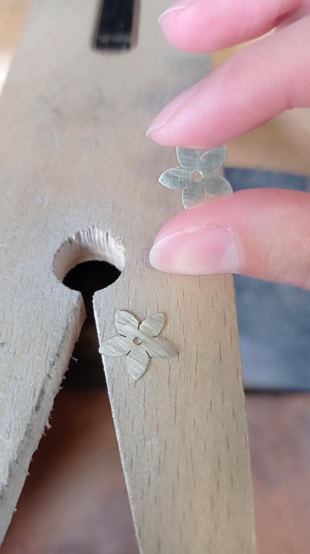Je travaille le laiton et l'argent grâce a des techniques traditionnelles de bijouterie : je découpe, mets en forme, soude, polis le métal pour en faire des bijoux.